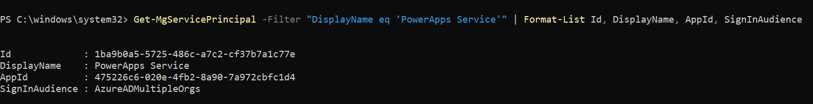 Get-MgServicePrincipal -Filter "DisplayName eq 'Power BI Service'" | Format-List Id, DisplayName, AppId, SignInAudience