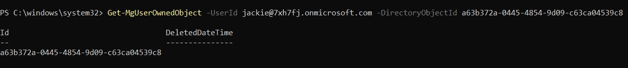 Get-MgUserOwnedObject -UserId jackie@7xh7fj.onmicrosoft.com -DirectoryObjectId a63b372a-0445-4854-9d09-c63ca04539c8