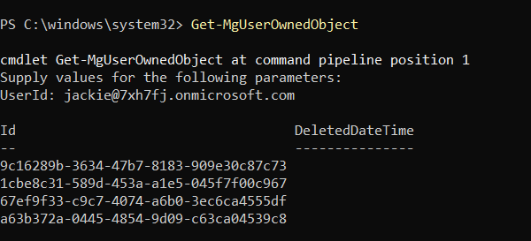 Get-MgUserOwnedObject -UserId jackie@7xh7fj.onmicrosoft.com