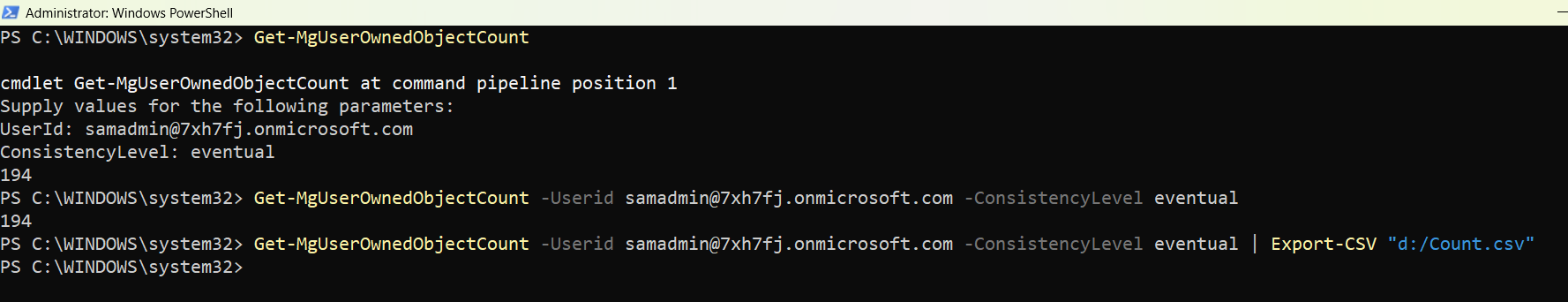 Get-MgUserOwnedObjectCount -Userid samadmin@7xh7fj.onmicrosoft.com -ConsistencyLevel eventual | Export-CSV "d:/Count.csv"