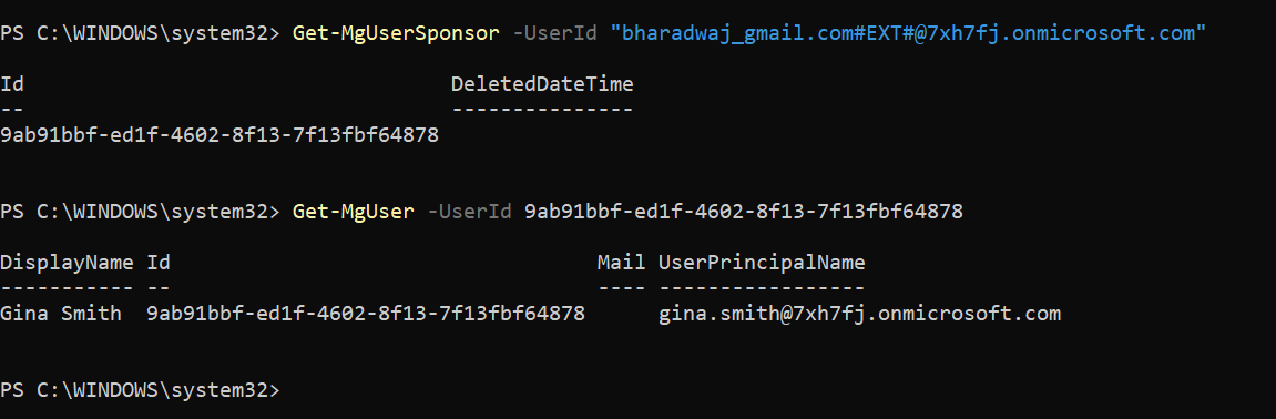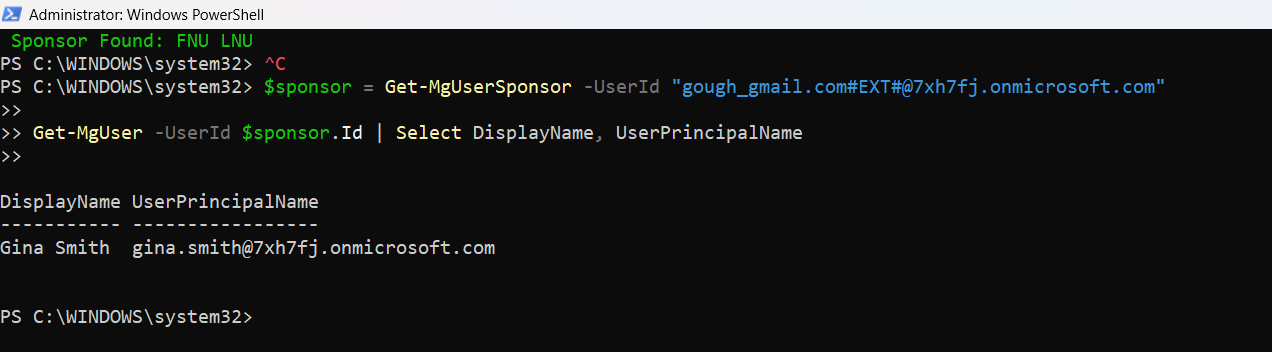 Get-MgUser -UserId $sponsor.Id | Select DisplayName, UserPrincipalName