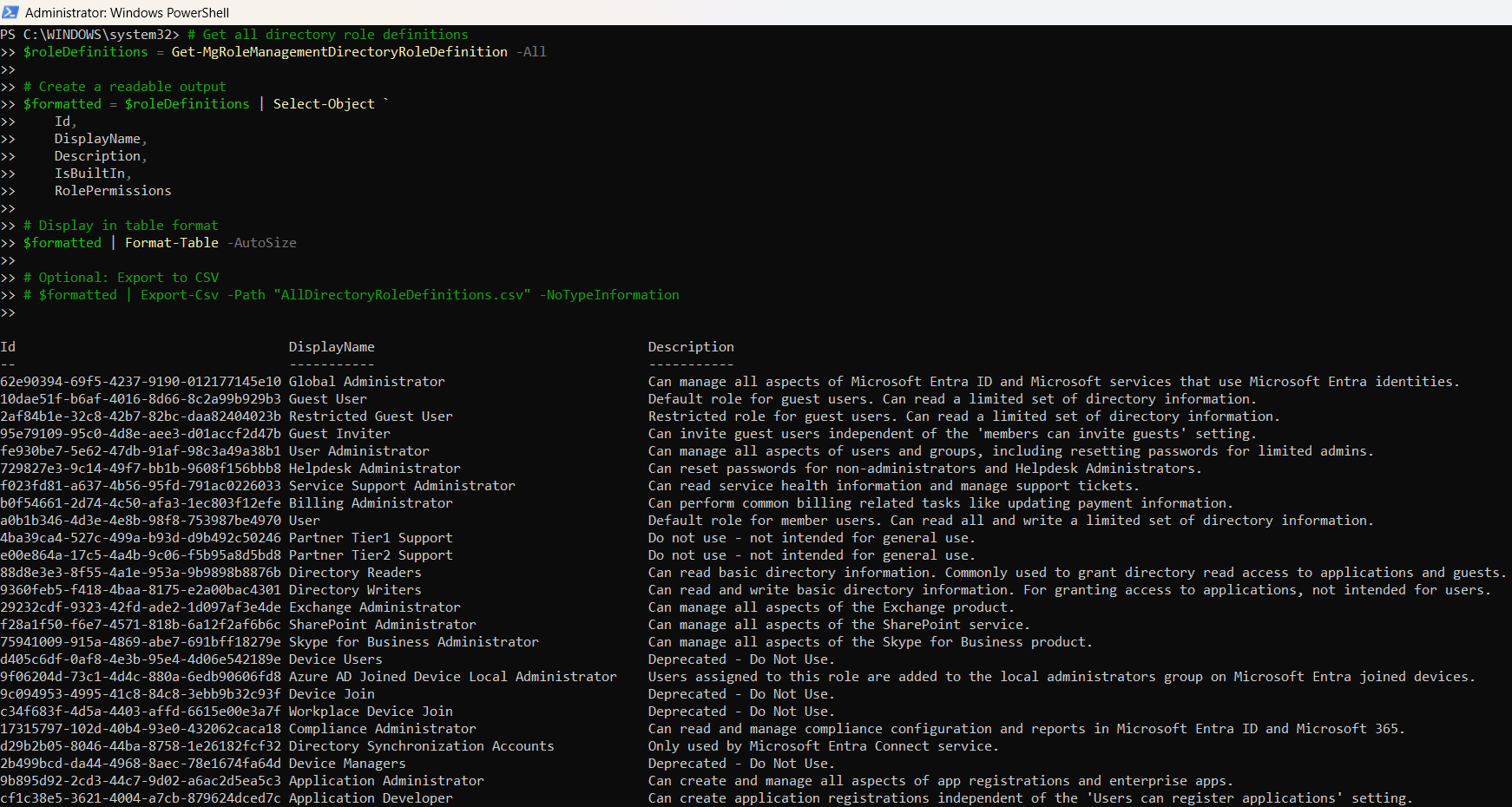 # $formatted | Export-Csv -Path "AllDirectoryRoleDefinitions.csv" -NoTypeInformation