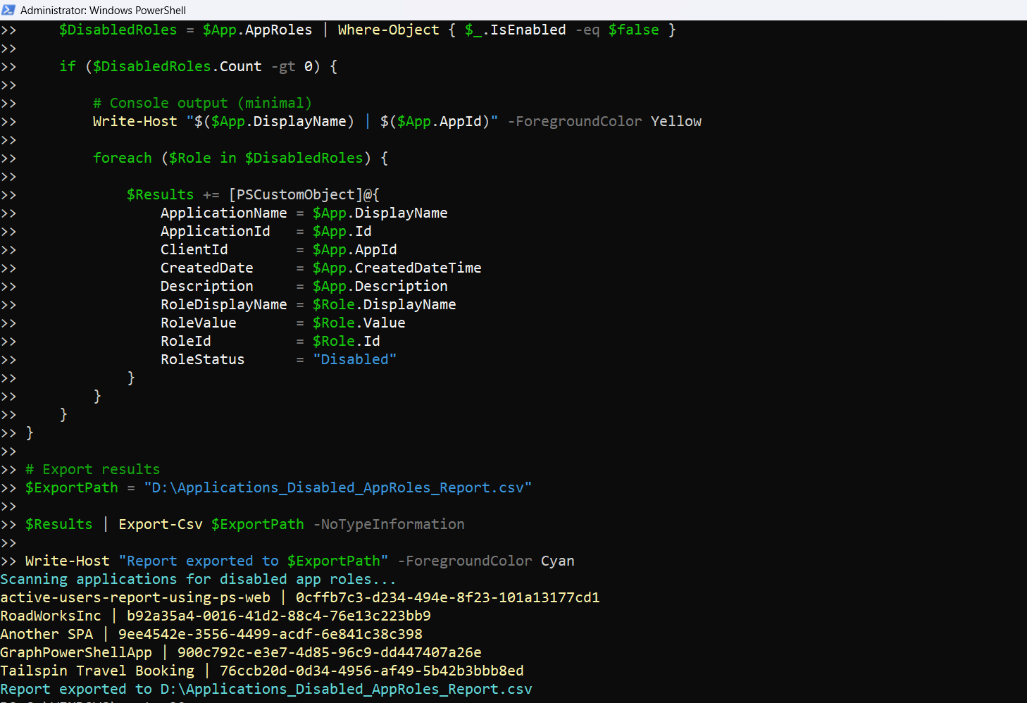 This script provides valuable insights into disabled app roles across Entra ID applications, helping administrators: