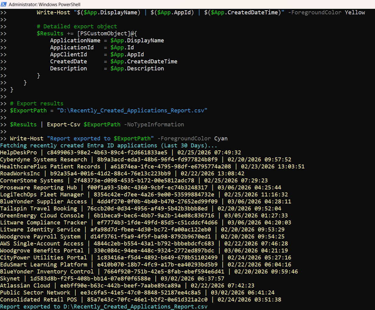 In this article, we’ll walk through a Graph PowerShell script that lists all Entra ID applications created in the last 30 days and exports the results to a CSV file.