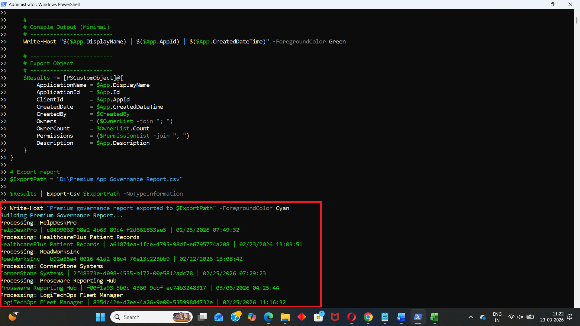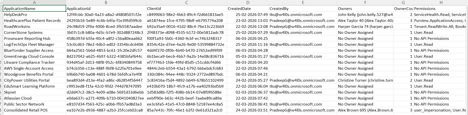 This script goes beyond basic reporting and delivers a complete governance view of newly created Entra ID applications.