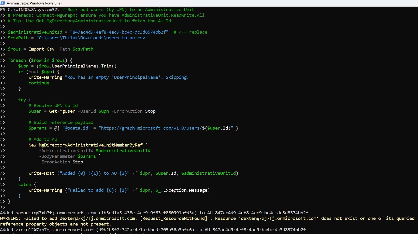 Write-Host ("Added {0} ({1}) to AU {2}" -f $upn, $user.Id, $administrativeUnitId)