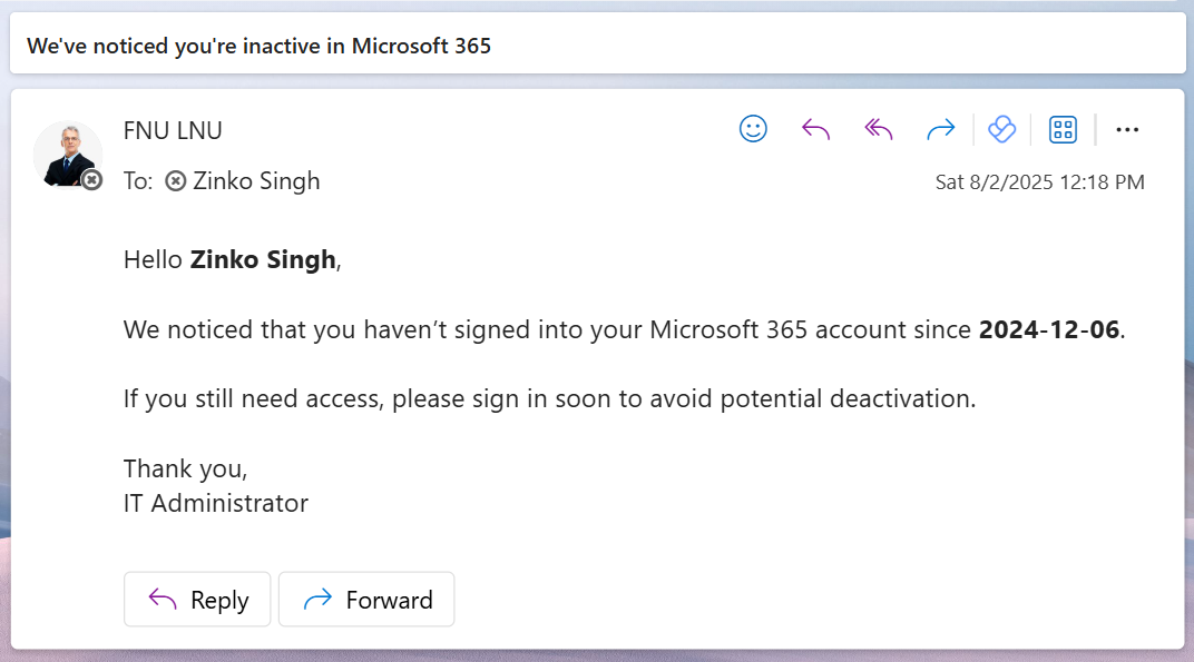Subject = "We've noticed you're inactive in Microsoft 365"