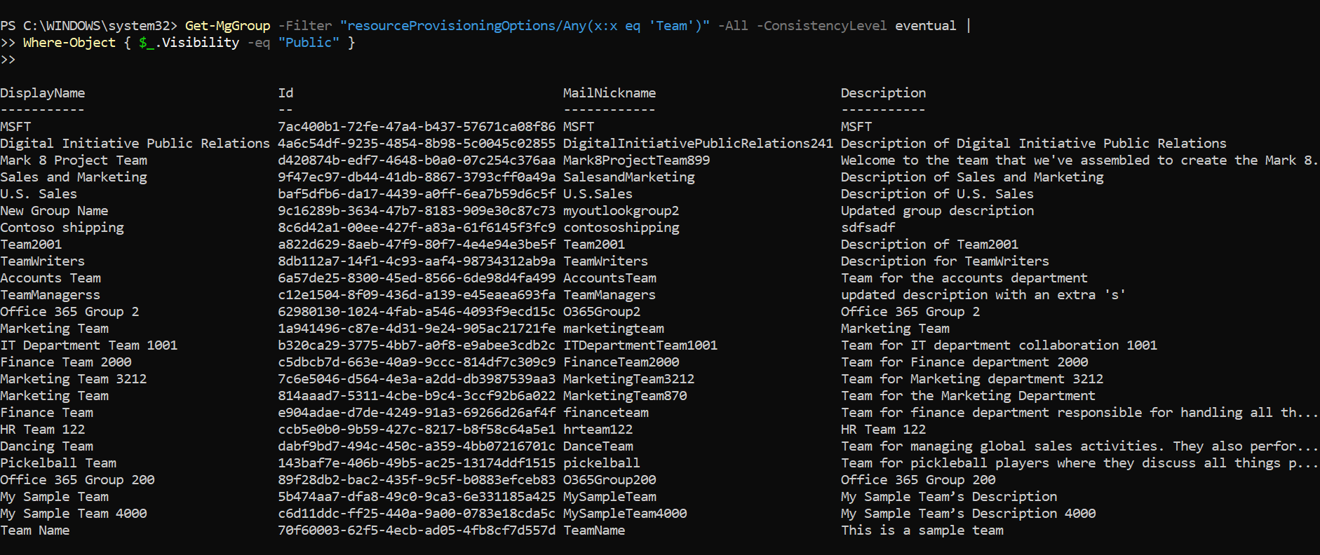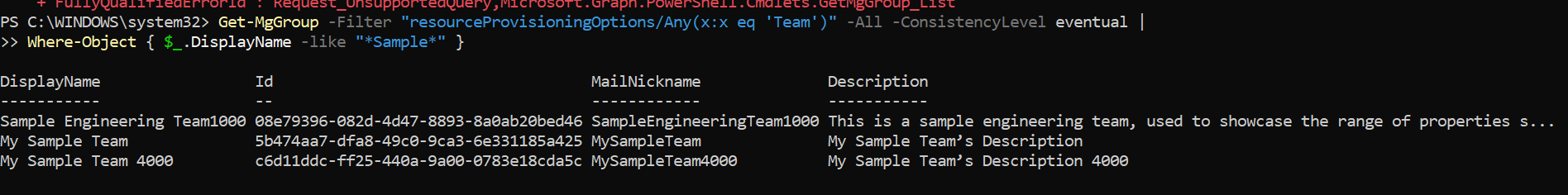 Get-MgGroup -Filter "resourceProvisioningOptions/Any(x:x eq 'Team')" -All -ConsistencyLevel eventual |