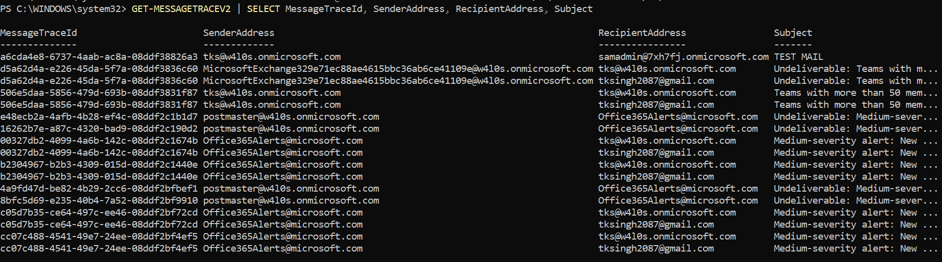 GET-MESSAGETRACEV2 | SELECT MessageTraceId, SenderAddress, RecipientAddress, Subject