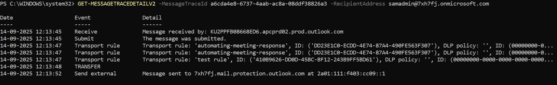 GET-MESSAGETRACEDETAILV2 -MessageTraceId a6cda4e8-6737-4aab-ac8a-08ddf38826a3 -RecipientAddress samadmin@7xh7fj.onmicrosoft.com