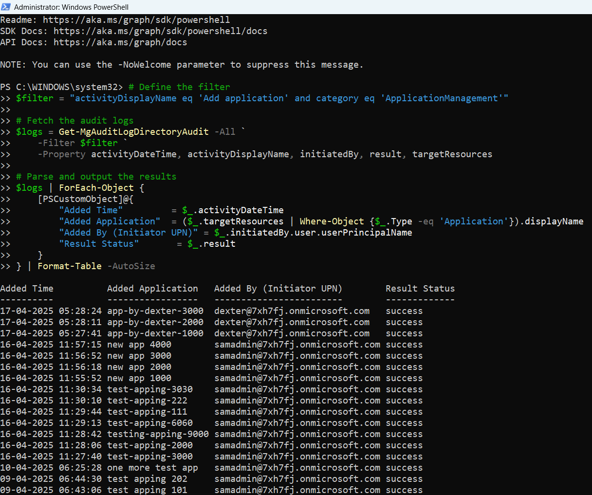 Monitoring when new applications are added to your Microsoft 365 environment is crucial for maintaining security and compliance. Using Microsoft Graph PowerShell, you can easily query the audit logs for "Add application" events under the "ApplicationManagement" category. In this article, we will provide you with a ready-to-use script, explain how it works, suggest further enhancements, list common use cases, cover possible errors & solutions, and wrap up with a conclusion.