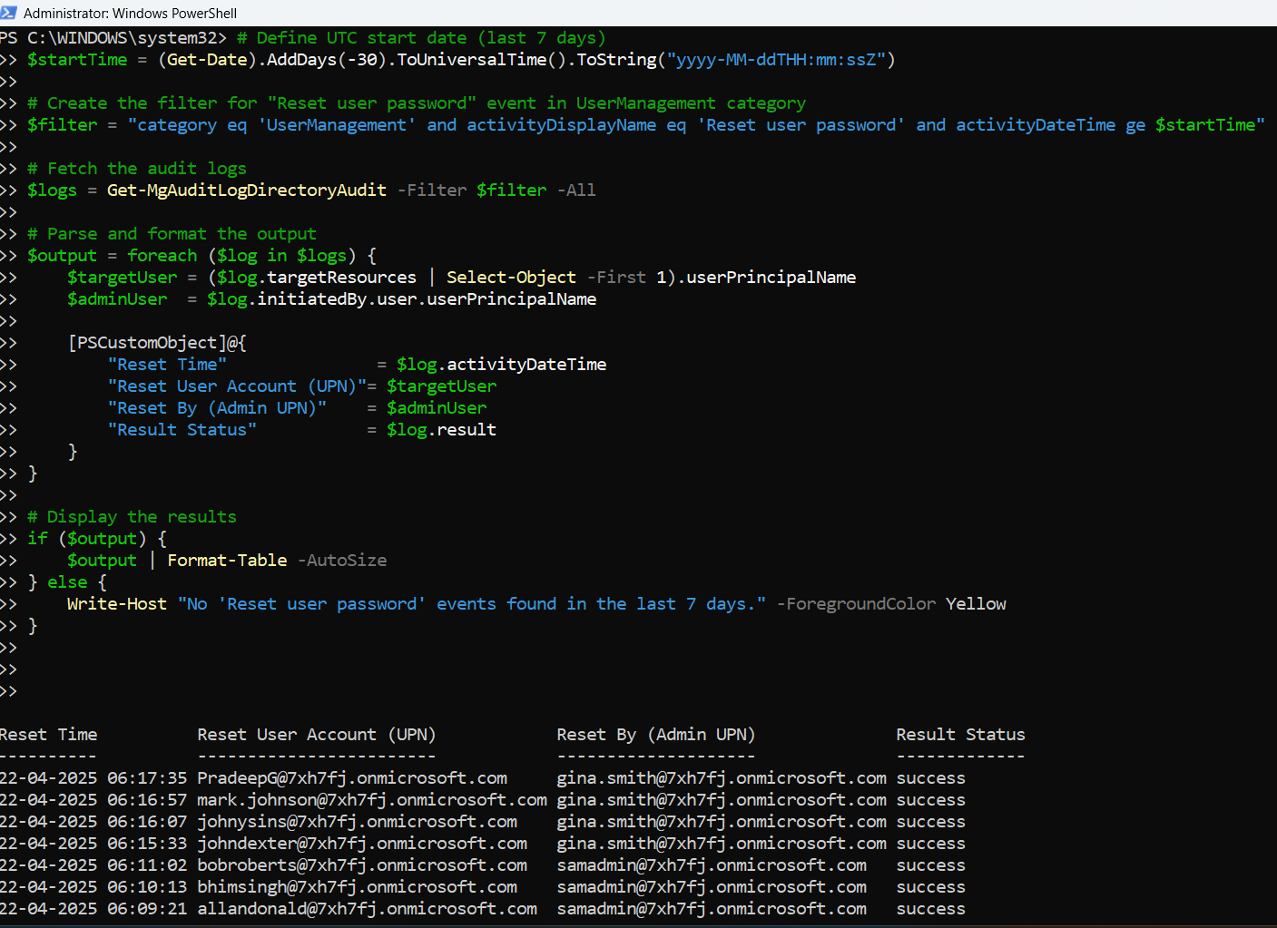 Write-Host "No 'Reset user password' events found in the last 7 days." -ForegroundColor Yellow