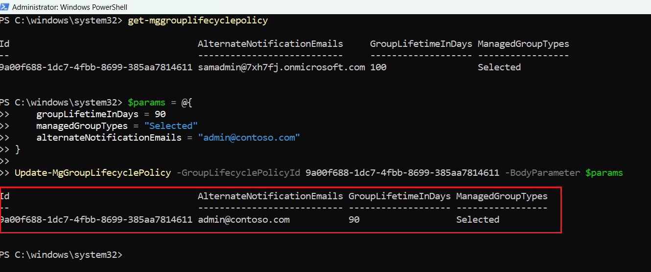 Update-MgGroupLifecyclePolicy -GroupLifecyclePolicyId $groupLifecyclePolicyId -BodyParameter $params
