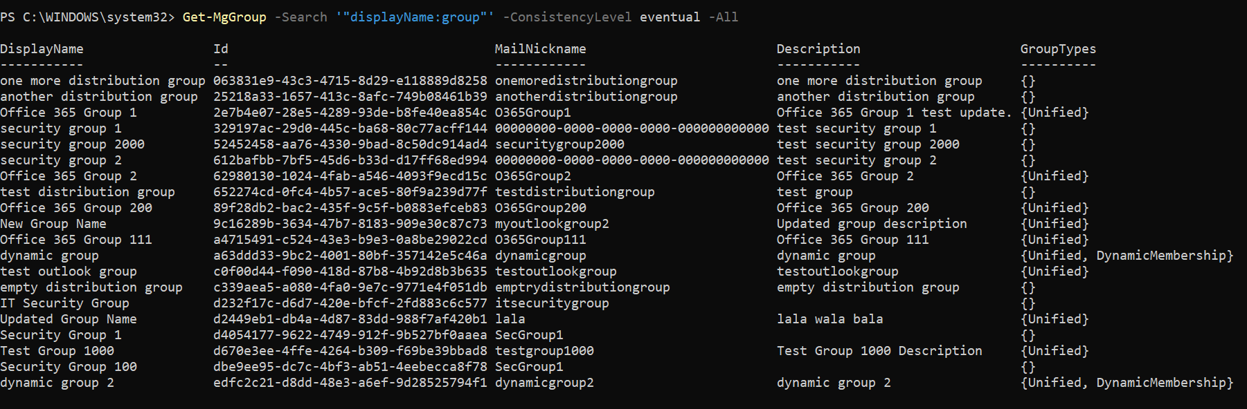 The -Search parameter in Get-MgGroup is ideal for quick lookups based on group names or descriptions. Whether you're searching for Teams groups, project groups, or admin lists, using -Search with the right syntax and flags gives fast and relevant results.