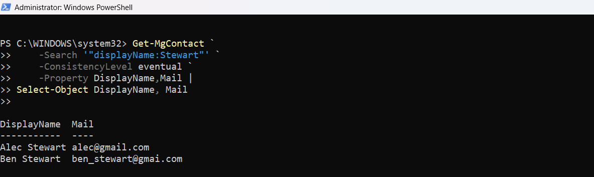 Get-MgContact -Filter "displayName eq 'Graham Bell'"