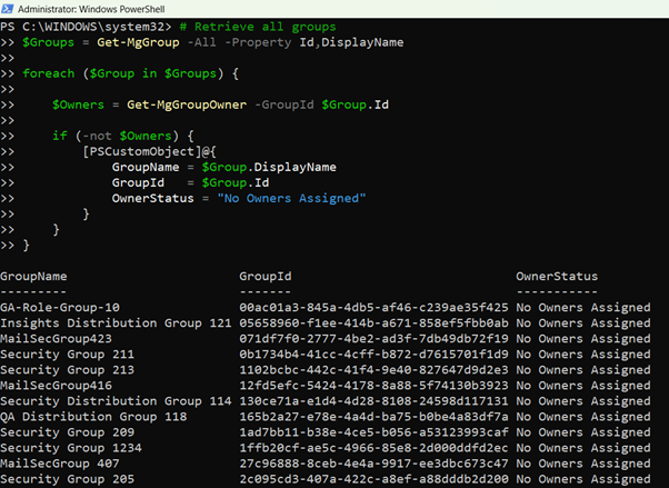 }This script lists all groups without assigned owners, allowing administrators to take corrective action.