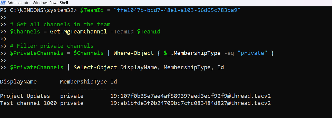 $Channels = Get-MgTeamChannel -TeamId $TeamId