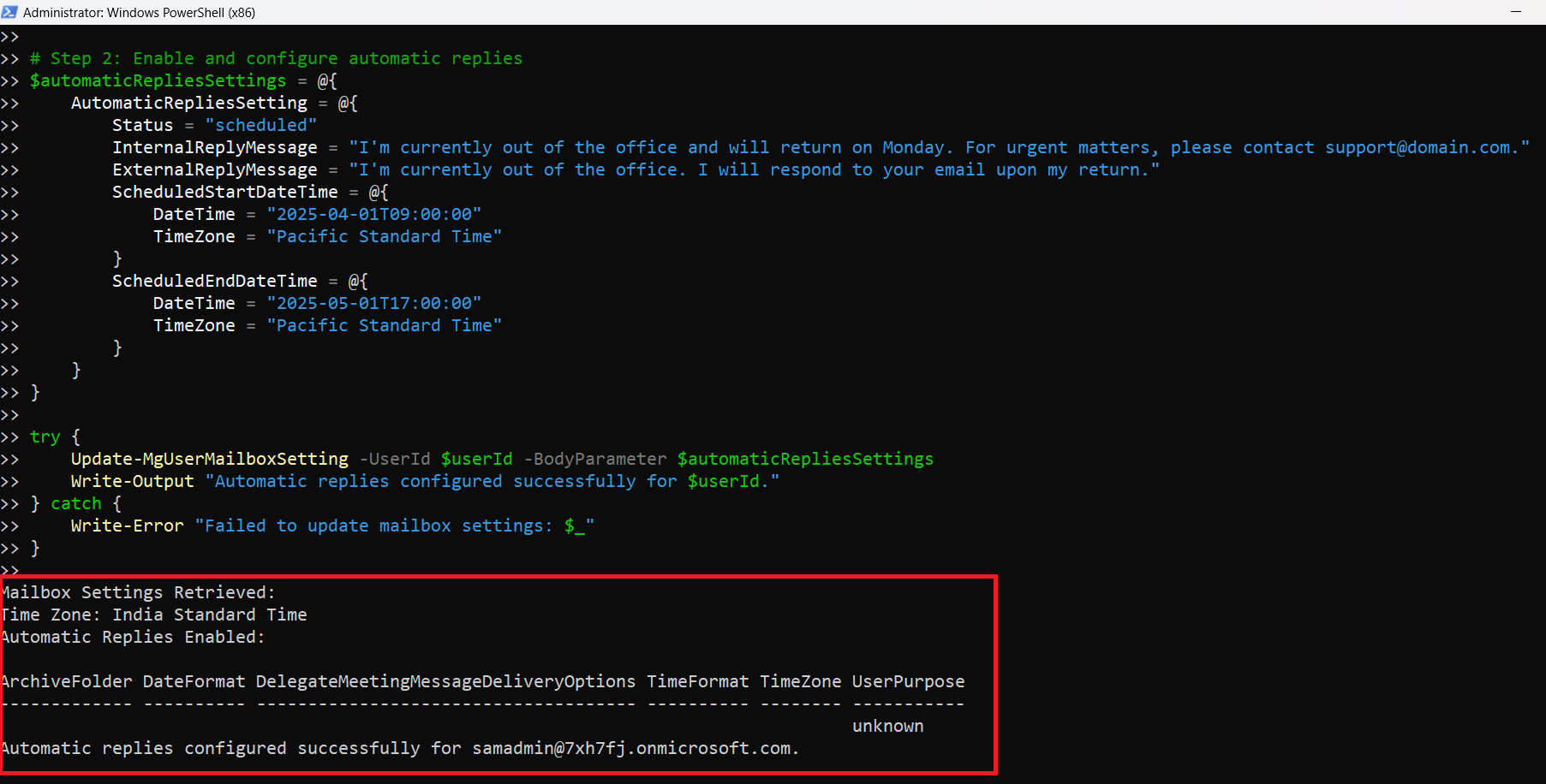 Write-Output "Automatic Replies Enabled: $($mailboxSettings.AutomaticRepliesStatus)"