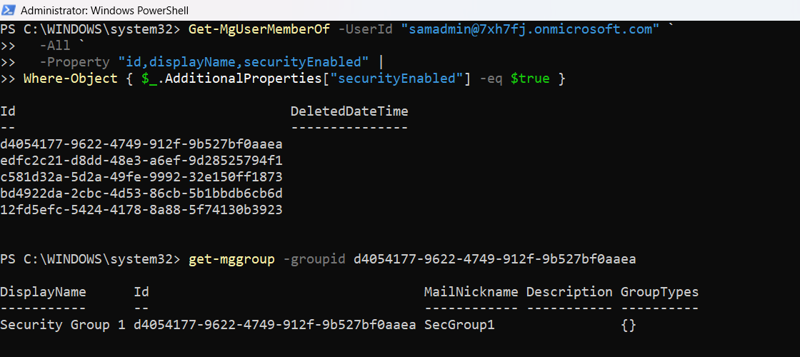 💡 This mirrors the nested Get-MgGroup inside Get-MgUserMemberOf logic from Graph PowerShell.