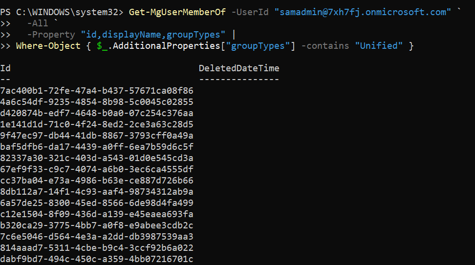 This command fetches only the IDs of the unified groups the user is a member of and lists them.