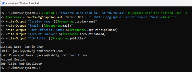 Write-Output "User Principal Name: $($response.userPrincipalName)"