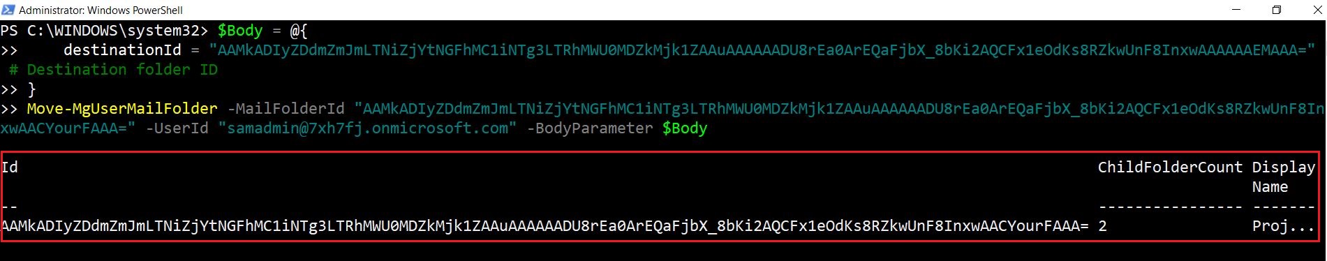 Move-MgUserMailFolder -MailFolderId "AAMkADhNWj..." -UserId "02627e97-4100-4c3e-9690-5740a44f4e24" -BodyParameter $Body