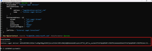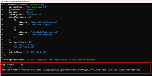 Note: You can check whether contact got added by running Get-MgUserContact. The newly added contact should appear in the list.