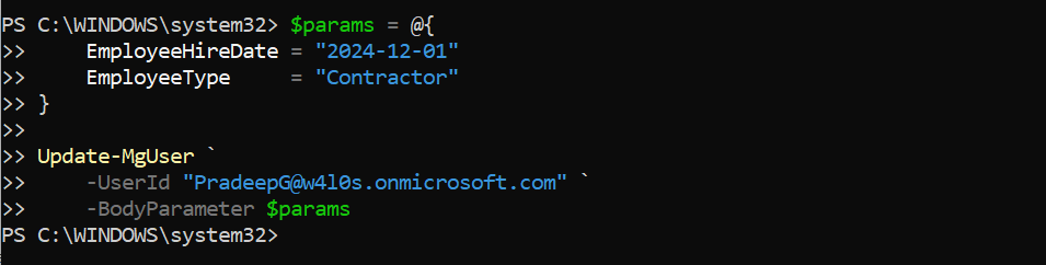 Update-MgUser -UserId $user.UserPrincipalName -BodyParameter $userParams