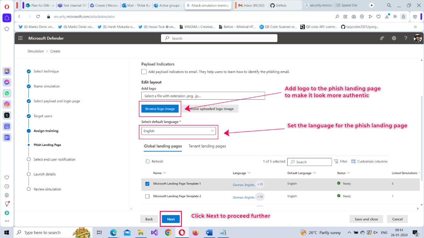 Once you select the landing page template from the library (as shown in Figure 10), you can set the language preference (English is the default option) and add a company logo to the phishing mail by clicking Browse logo image to make it look authentic.