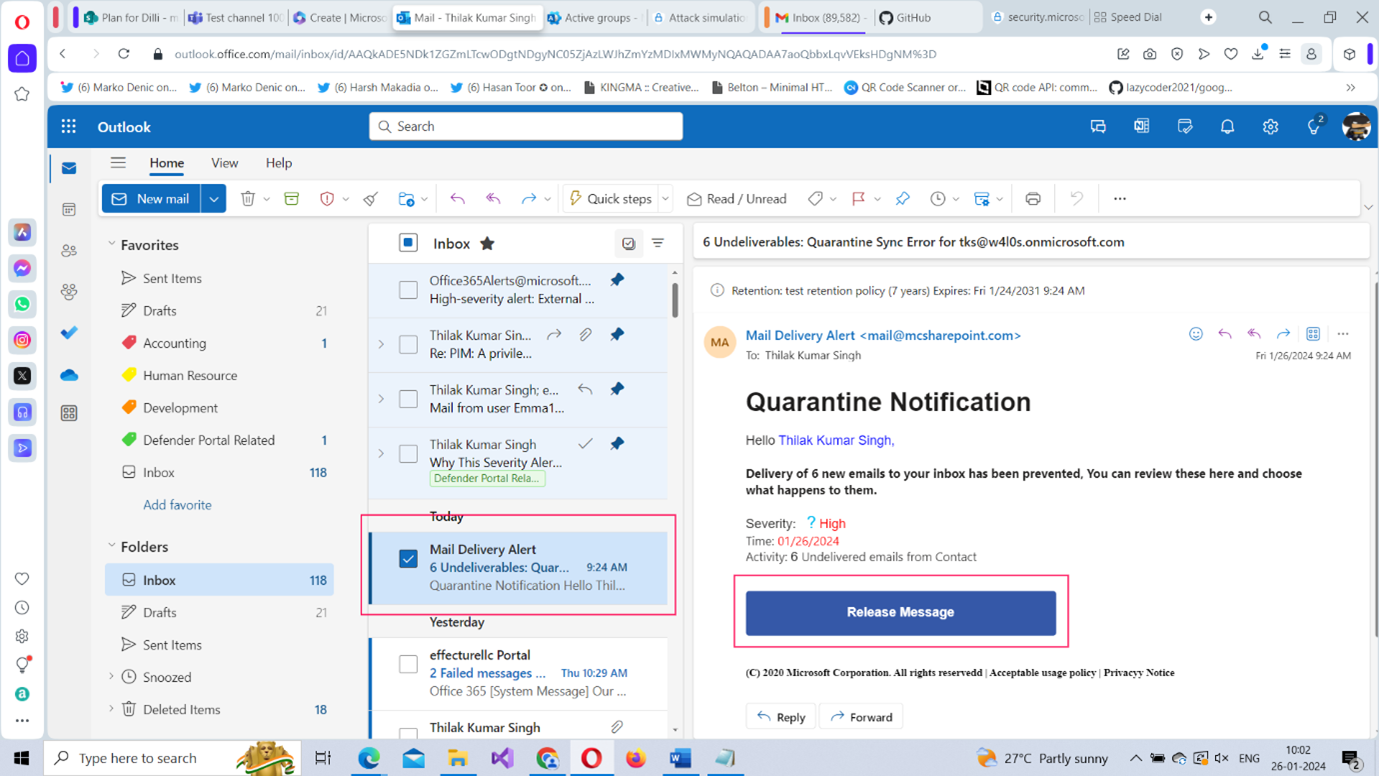 Check your Microsoft Outlook inbox. You should receive a Quarantine Notification (shown in Figure 16) suggesting that emails are not reaching your inbox and that you can get them if you click the Release Message button. Go ahead and click it.