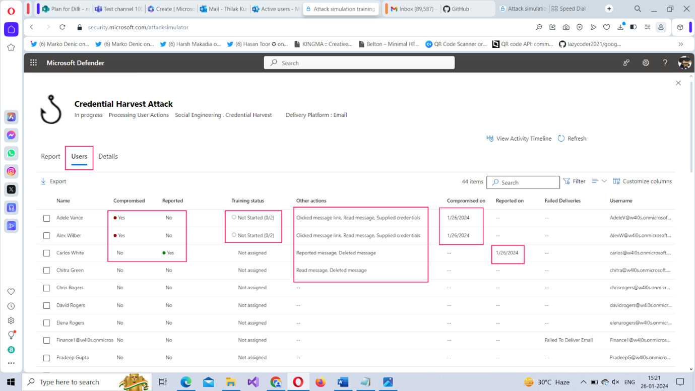 Select the Users tab to get user-related details as shown in Figure 22. Here you get a detailed view of users who were compromised, those who reported the message, and those who deleted it, etc., The training status column helps you identify whether users who failed the attack have taken the allotted training or not.