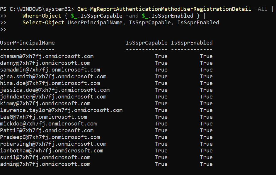 Select-Object UserPrincipalName, IsSsprCapable, IsSsprEnabled