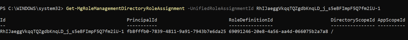 Get-MgRoleManagementDirectoryRoleAssignment -UnifiedRoleAssignmentId "RhIJaeggVkqqTQZgdbKnqLD_j_s5eBFImpF5Q7fm2iU-1"