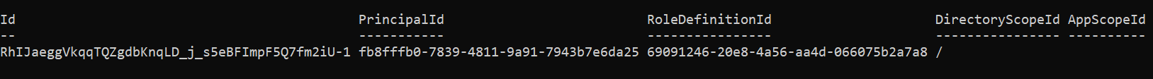Get-MgRoleManagementDirectoryRoleAssignment -Filter "principalId eq 'b1368af9-0f0a-41cf-85b7-63ef13eabc87'" -All