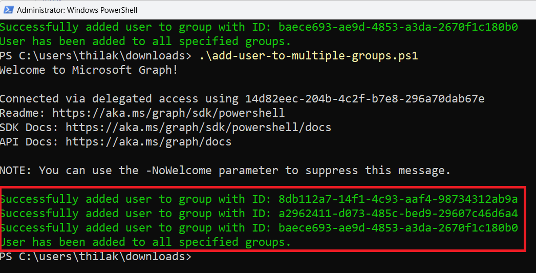 Write-Host "Successfully added user to group with ID: $groupId" -ForegroundColor Green