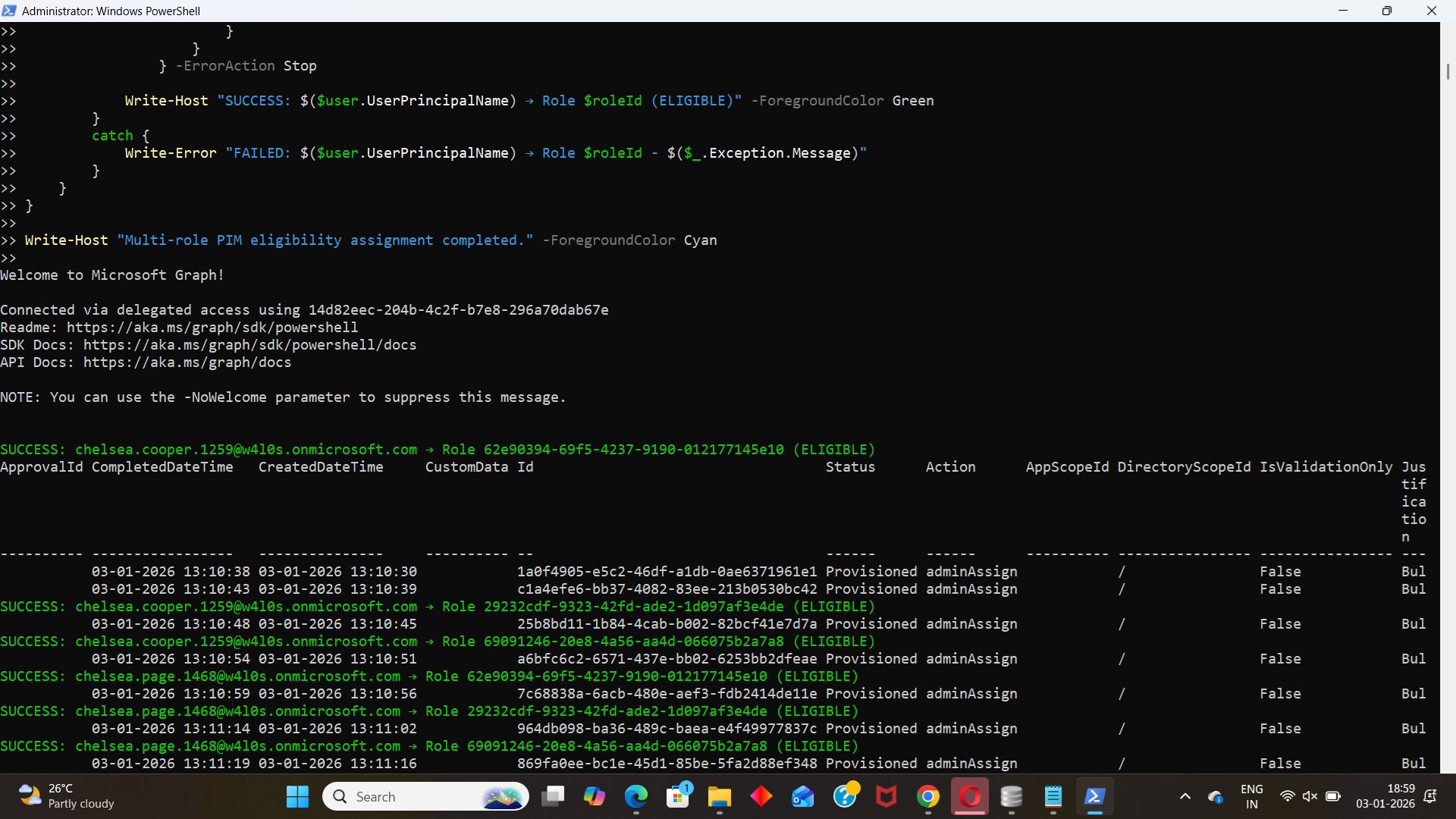 Using Microsoft Graph PowerShell, administrators can securely and efficiently assign multiple PIM-eligible admin roles to multiple users using a CSV file—without relying on manual portal workflows.