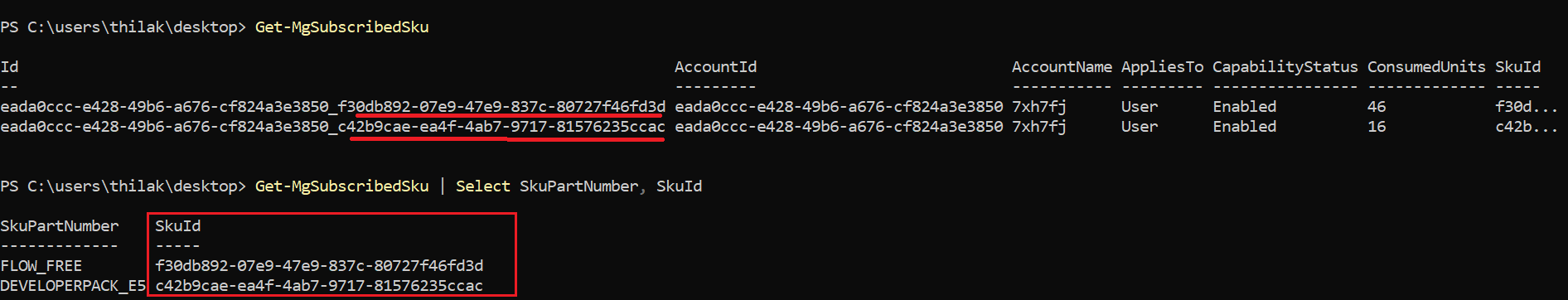 📌 SkuId can be obtained by referring to the license name (identified by SKUPartNumber) you wish to assign. Use Get-MgSubscribedSku | Select SkuPartNumber, SkuId to fetch the license SkuId and SkuPartNumber.