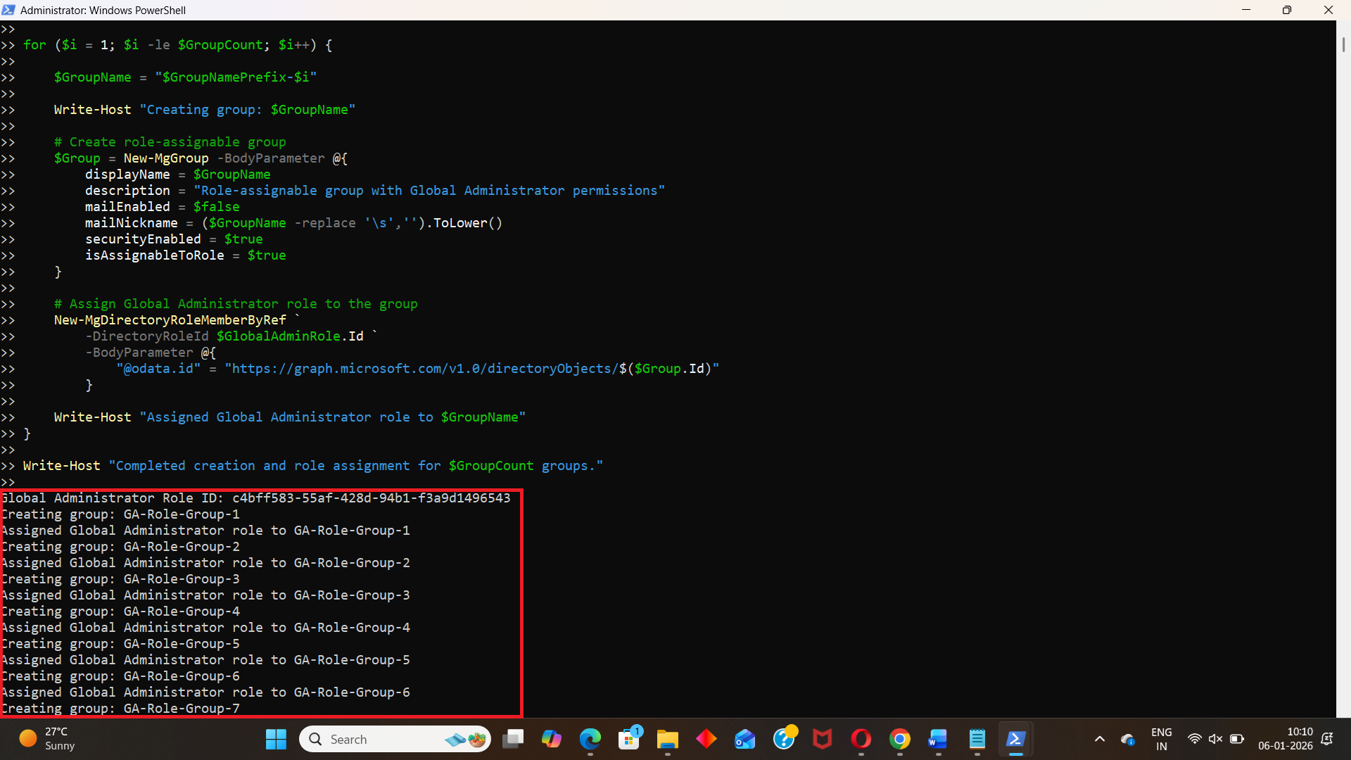 Write-Host "Completed creation and role assignment for $GroupCount groups."