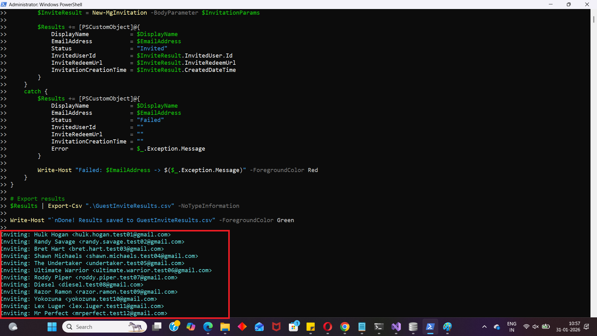 Write-Host "`nDone! Results saved to GuestInviteResults.csv" -ForegroundColor Green.