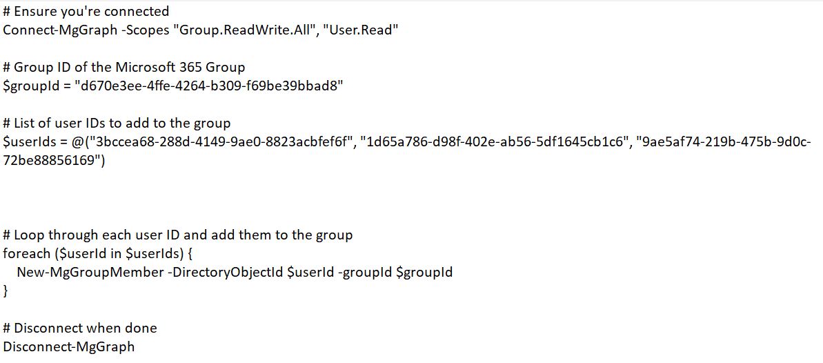 Create an array of user ids, loop through the array and execute the New-MgGroupMember cmdlet. Ensure you pass the user ids to the -DirectoryObjectId parameter and the Group ID to -groupId parameter.