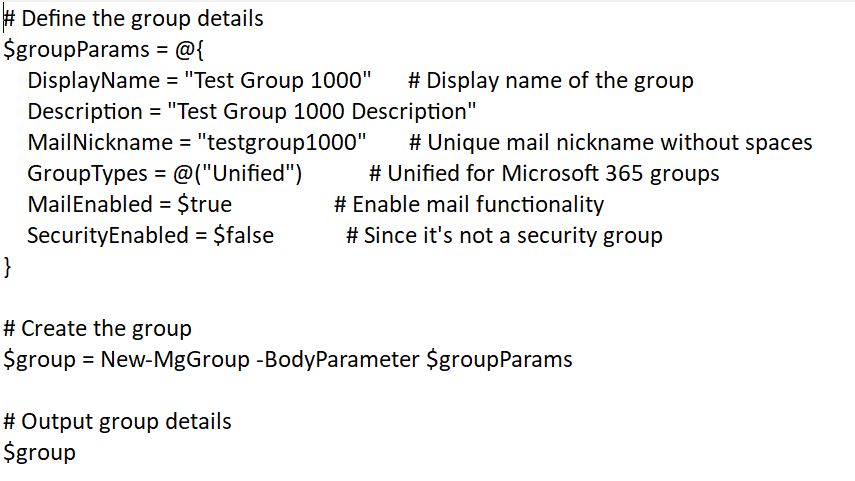 Here’s the script for creating a Microsoft 365 Group using PowerShell:
