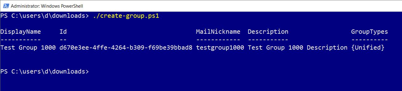 Navigate to the location where the PowerShell script for creating the Microsoft 365 Group exists and run the script as shown in the image. The details of the newly created Microsoft 365 Group gets displayed.