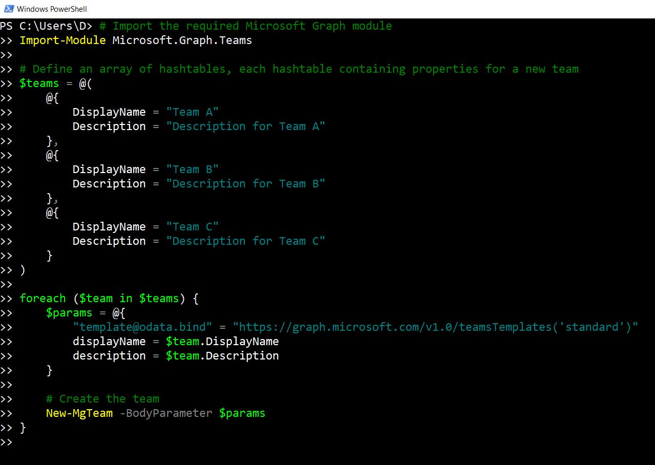 This script is versatile and straightforward. It allows you to easily add more teams to the array by defining additional hashtables. Each time the script runs, it will create all the teams listed in the $teams array.