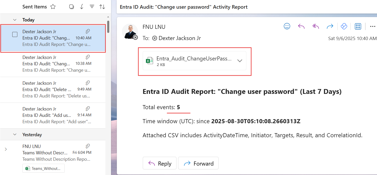Tracking password changes is essential for both security visibility and compliance. With this script, you can automatically fetch “Change password (self-service)” audit logs from Entra ID, export them to a CSV, and send them straight to your inbox. Schedule it for regular runs and enhance with alerting, and you’ll have a reliable guardrail for one of the most critical user activities in your tenant.