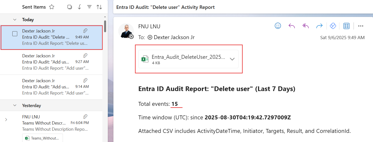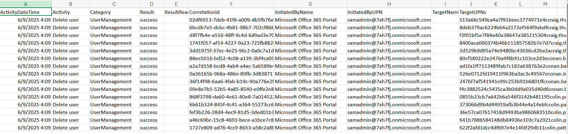 <p>Attached CSV includes ActivityDateTime, Initiator, Targets, Result, and CorrelationId.</p>