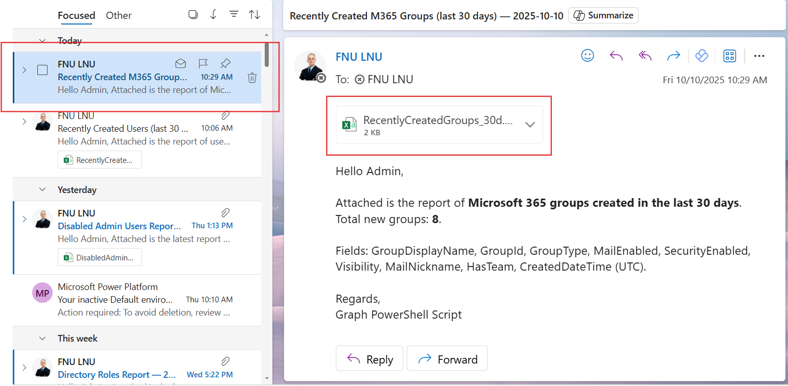 This Microsoft Graph PowerShell script helps administrators maintain visibility into newly created Microsoft 365 groups, ensuring proactive governance and security awareness. By automatically emailing the report, it saves time, eliminates manual checks, and provides instant insight into new group creations.
