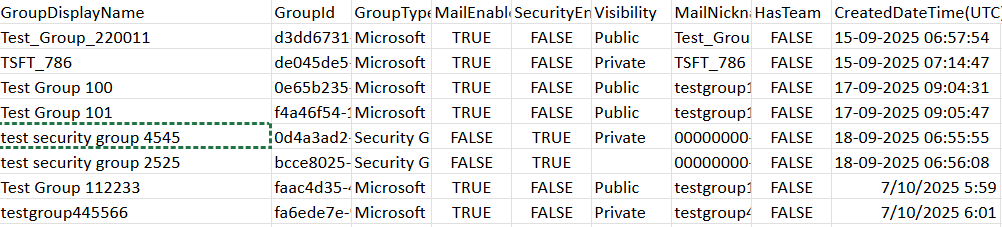 Fields: GroupDisplayName, GroupId, GroupType, MailEnabled, SecurityEnabled, Visibility, MailNickname, HasTeam, CreatedDateTime (UTC).