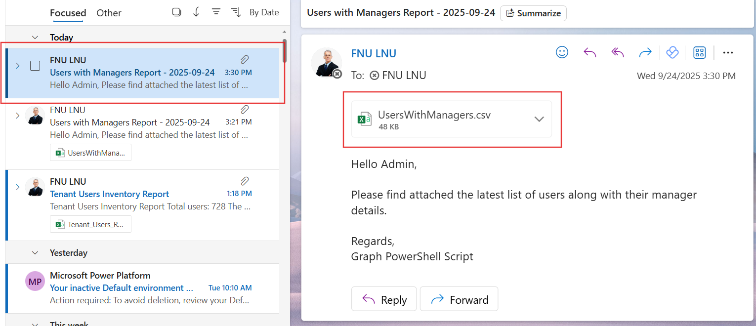 This script provides administrators with a straightforward way to fetch users and their managers and deliver the report directly to their inbox. By automating the process, it saves time, improves visibility into reporting relationships, and supports HR and IT governance needs.