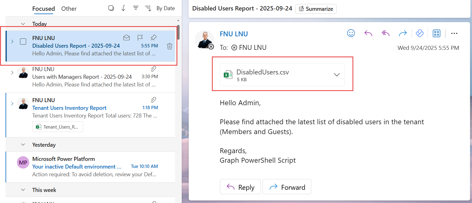 This script is a practical and efficient way for administrators to track disabled accounts across their Microsoft 365 tenant. By automating the export and delivery via email, it eliminates manual checks and ensures consistent visibility into user account status.