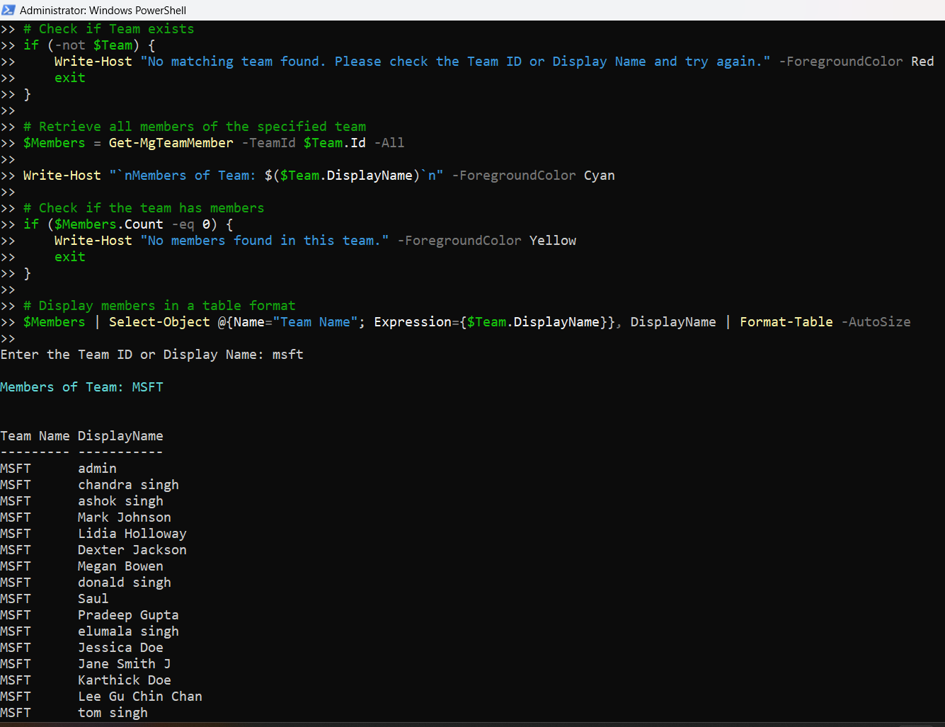 Below is the PowerShell script that retrieves and displays Team members: